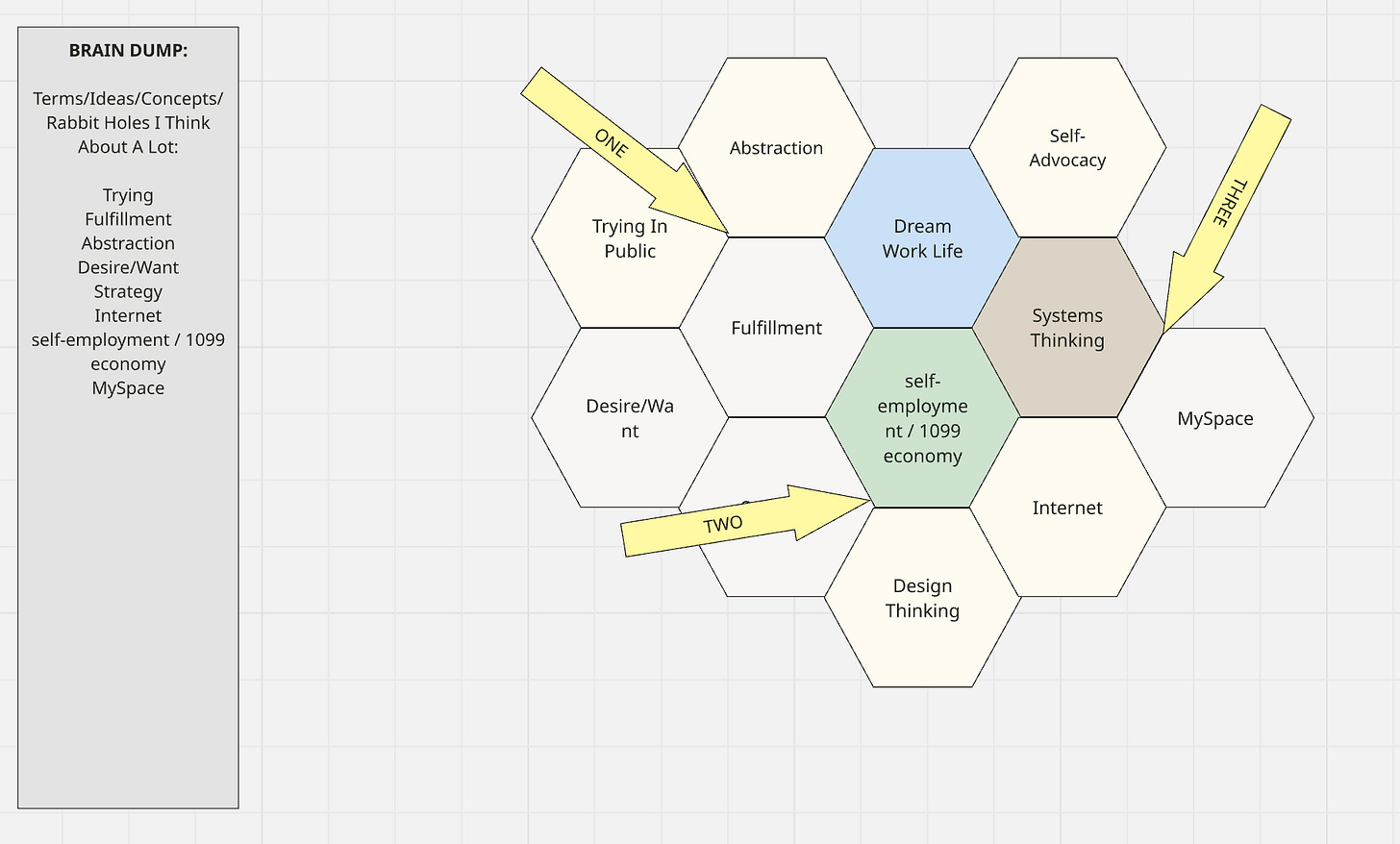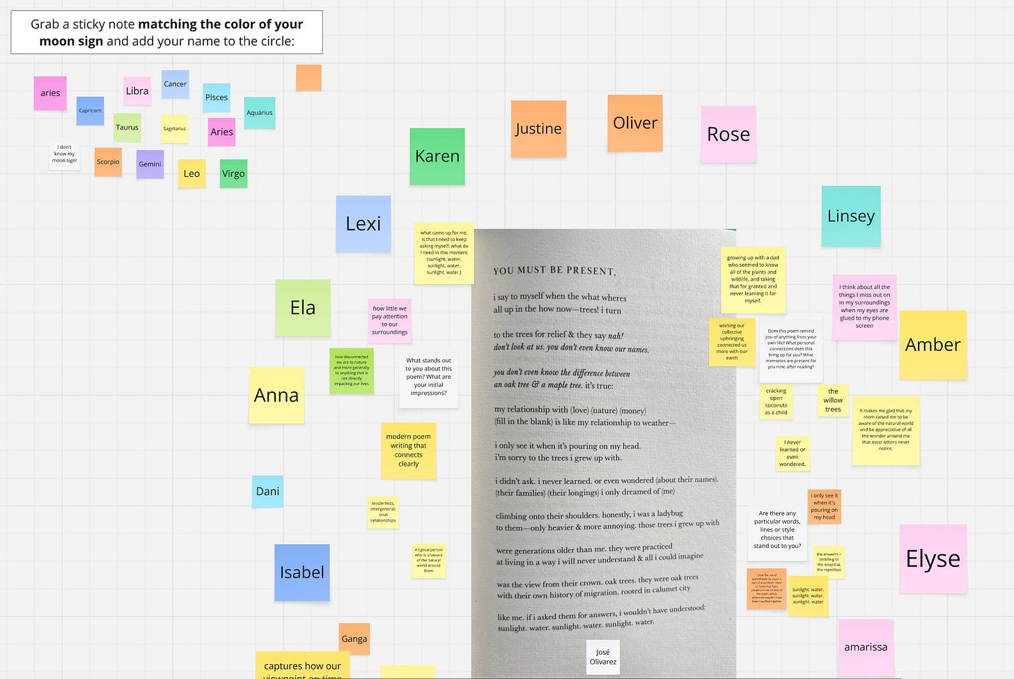 When I teach a free/live workshop, that can mean inviting anywhere from 30-100+ strangers into a Zoom room — this becomes a relatively easy thing to “check out” of. While I never demand complete attention or cameras on, I do like to try and create some sense of place, usually through a Miro board. Simply having attendees write their names on a sticky note and arrange them in a circle or at a few virtual “tables” can be enough to invite a more active participation.