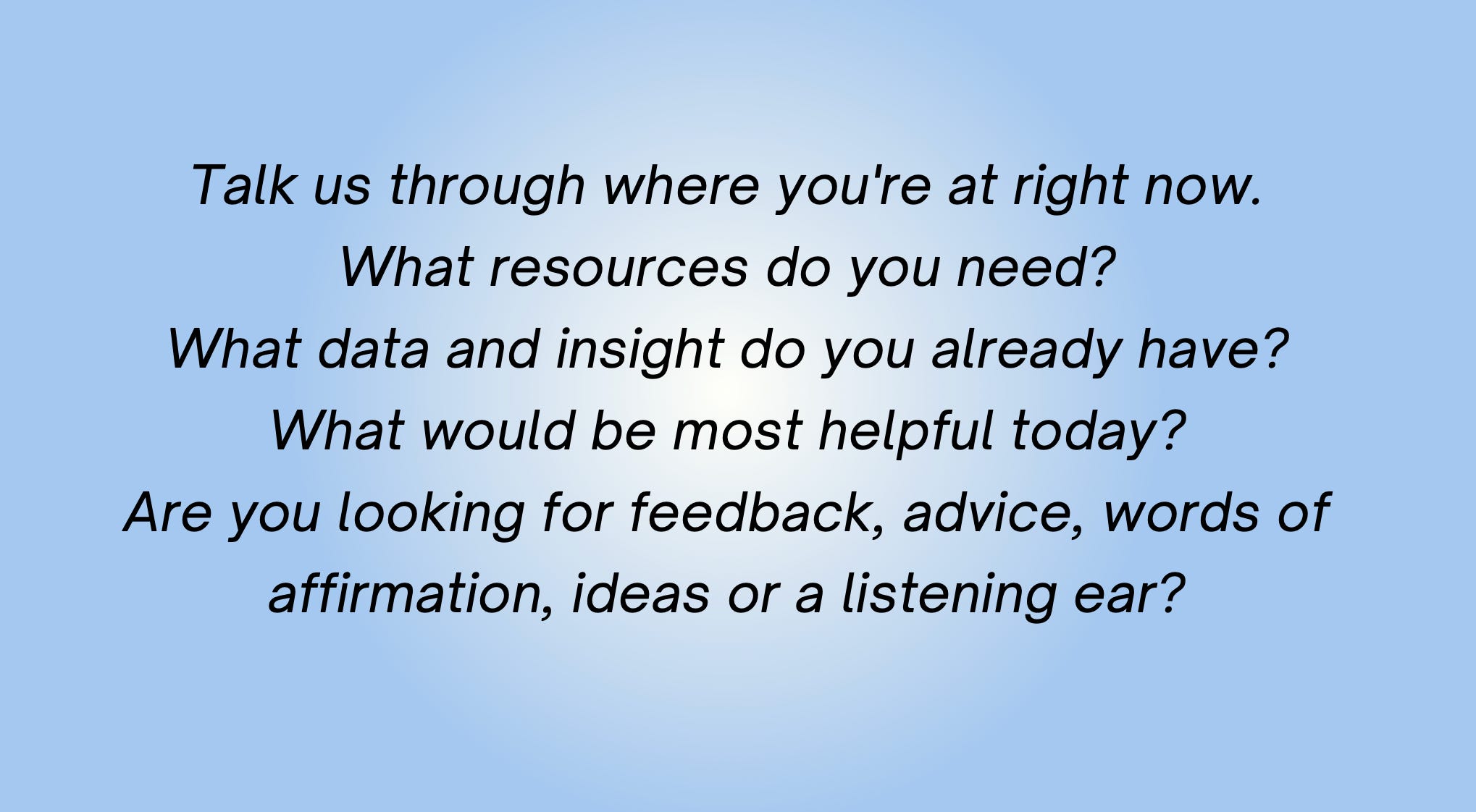 Every creative type knows how it feels to be drowning in ideas and then have someone give you five more things you “should” try, so we just ask that anyone who brings us a strategic challenge tells us what they’re looking for: Feedback, advice, words of affirmation, ideas, or a listening ear.