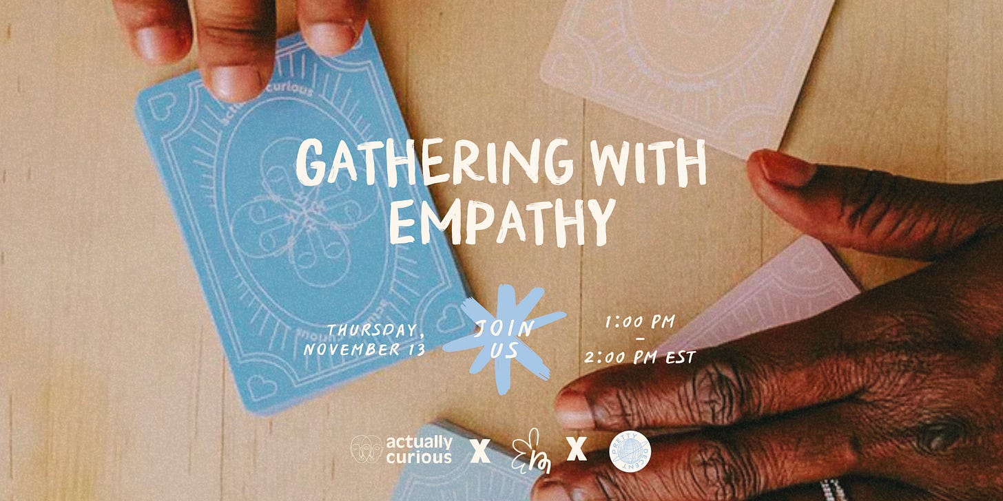 P.S. This Thursday, I’m teaming up with Actually Curious and Daisy Made to host a workshop for facilitators. It’s called Gathering With Empathy, and I’d love to see you there — it will be a very fun chance to try out some new ways of bringing people together, and an opportunity to meet some new Internet Friends. Here’s a link for tickets. (Or enter a giveaway here!)