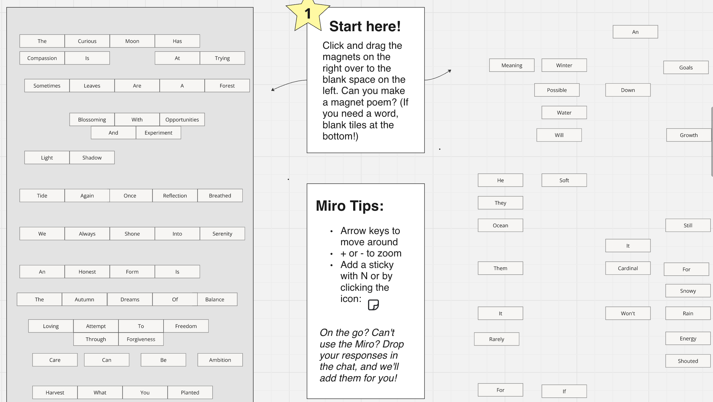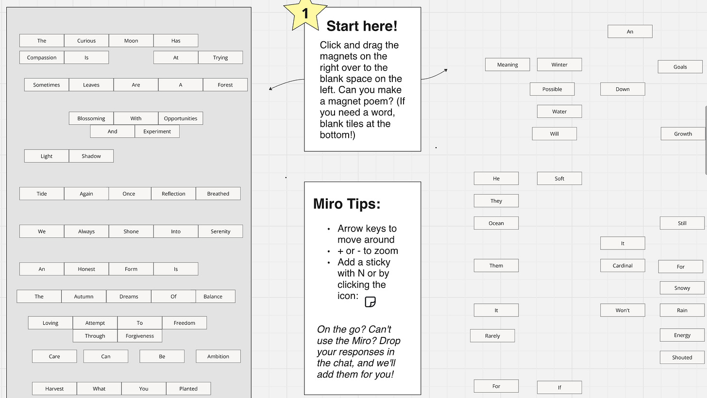 It always takes a few minutes for everyone to show up to a Zoom meeting, so I like to have something prepped for people to play with while they wait. One of my favorite activities is a take on magnet poetry, which I put together as a collection of individual elements on a Miro board. I drop the link in the chat, and ask people to rearrange the blocks to make their own poem.