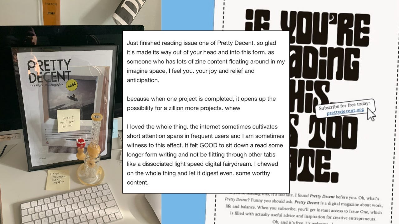 It is vulnerable to care a lot about something without the guarantee of outside acceptance or approval. By the time I finally released that first issue to the public, I think I knew (or perhaps had decided) that it wasn’t going to pan out. It was so much work for such little payoff. I’d put it out for free, as a “lead magnet,” but no one really knew who I was or what Pretty Decent was supposed to be. When it didn’t go viral instantly and change my life overnight, I figured it was over.